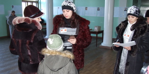 Члены одной из участковых избирательных комиссий уничтожают при помощи охотничьего ножа пачку неиспользованных бюллетеней. Получилось эффектно и очень зловеще. Присутствующим понравилось. Особенно иностранным наблюдателям.