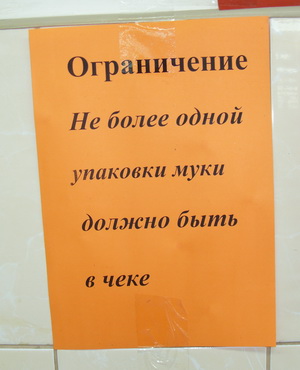 В Краматорске за несколько последних дней в супермаркетах образовался ажиотажный спрос на муку. Для того, чтобы полки опустошались не столь стремительно, администрация магазинов ввела ограничение на продажу этого продукта питания: в некоторых супермаркетах не дают муки больше одной упаковки на чек, в других – не больше 5 кг.