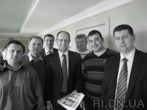 На фото: лидер партии "Фронт Перемен" Арсений Яценюк, лидер Краматорской городской организации "Фронт Перемен" Владимир Ржавский, депутаты Краматорского городского совета Николай Кутепов и Андрей Васфеев, депутат Славянского городского совета Олег Зонтов. |