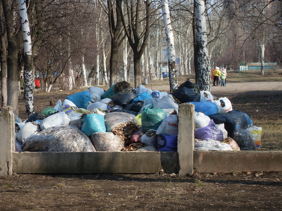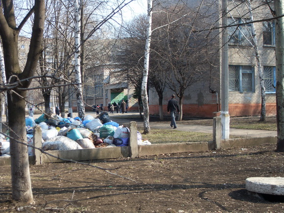 Возле забора Краматорской школы № 3 уже который месяц лежит свалка мешков с листьями, собранными в мешки еще осенью. Свалка образовалась внушительная – целая гора мешков, полных под завязку. Все это лежит во дворе школы, но на виду всех прохожих улицы Нади Курченко.