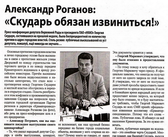 Конфликт между народным депутатом Украины Георгием Скударем и городскими властями перешел в открытую стадию. Сегодня в муниципальной газете «Краматорская правда» вышло большое интервью главного городского регионала и директора водоканала Александра Роганова, которое является ответом городских властей на критику, прозвучавшую во время пресс-конференции Георгия Скударя.