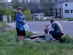 Вчера из-за аварии на водоканале жителям микрорайона «Лазурный» пришлось набирать воду из колонки, которую работники водоканала прикрутили к одному из люков водоснабжения.
