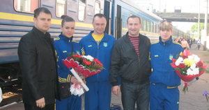| Чемпионок встречают на краматорском железнодорожном вокзале. Слева направо: депутат горсовета Андрей Васфеев, Вера Будник, тренер Сергей Лукьянченко, депутат горсовета Александр Толстогузов, Анна Охрей. |