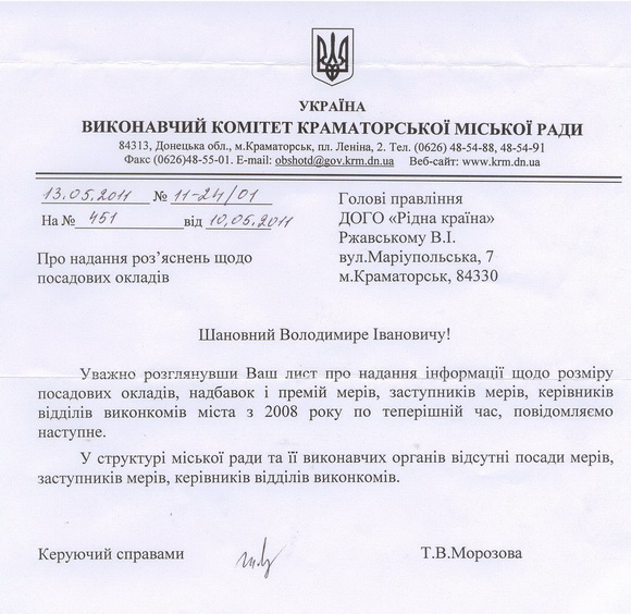 Краматорский исполком отказался выдавать общественной организации «Рідна країна» информацию о должностных окладах городского головы из-за того, что общественники неправильно назвали его должность.