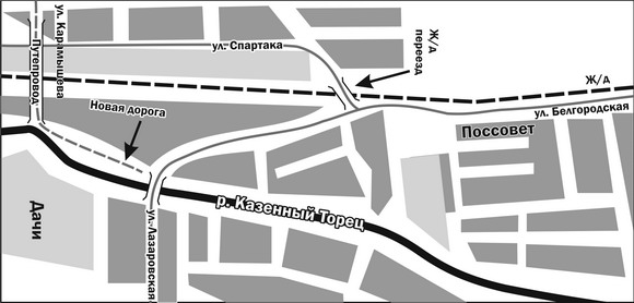 Кроме путепровода будет построен участок новой дороги протяженностью около километра. «Новая дорога будет брать свое начала в районе поворота с улицы Белгородской на мост по Лазаревской. Асфальт будет проложен по существующему продолжению улицы Белгородской между жилым сектором и Торцом. Затем дорога будет делать поворот направо и в этом месте будет возводен путепровод через железную и автомобильную дороги. В районе перекрестка Спартака и Карамышева будет строиться развязка», - рассказывает Владимир Азарянц. Впрочем, городские власти сомневаются, что этот проект будет реализован в ближайшее время.