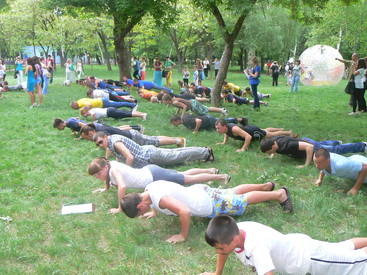 Участники отжались 24473 раза, ровно столько дней прошло от победы в Великой Отечественной войне до 9 мая 2012 года.