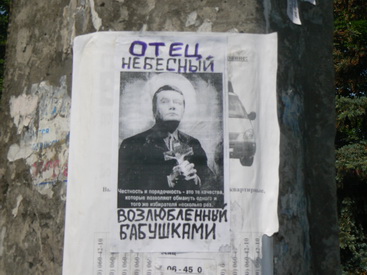 Надпись на листовке гласит следующее: «Отец Небесный. Честность и порядочность – это те качества, которые позволяют обмануть одного и того же избирателя несколько раз. Возлюбленный бабушками».