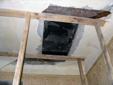 Cейчас кусок обвалившийся плиты, оставшийся в потолке, работники ЖЭКа подперли сваями. Сколько времени она простоит не известно.