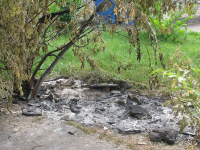 Зрелище, которое предстало перед нашими глазами, было действительно ужасным. На клочке земли примерно 2х3 метра - пепелище: видны куски фанеры, зола, почерневшие от огня и копоти камни.