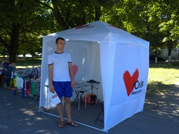 Вчера, 25 июля, в районе Крытого рынка появилась палатка объединенной оппозиции "За Батькивщину". Оппозиционеры раздают жителям газеты. Статьи в них ориентированы в основном против господина Януковича.