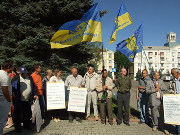 Перед началом сессии городского совета, на которой должен был рассматриваться проект решения о реализации в городе закона «Об основах языковой политики», у входа в исполком собралось около десятка человек под флагами партий «Собор» и РУХ.