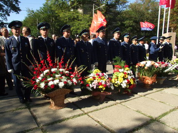 В завершение недолгого митинга к вечному огню легли роскошные корзины с цветами и скромные букетики.