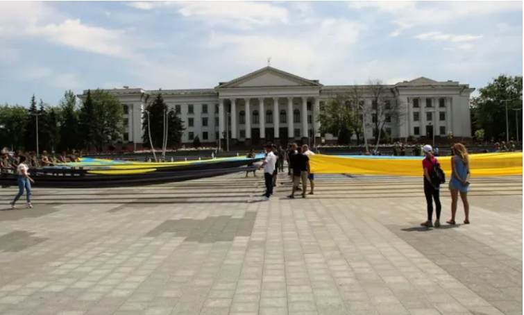 На главной площади Краматорска военные и гражданские развернут большие флаги Украины и Донецкой области.