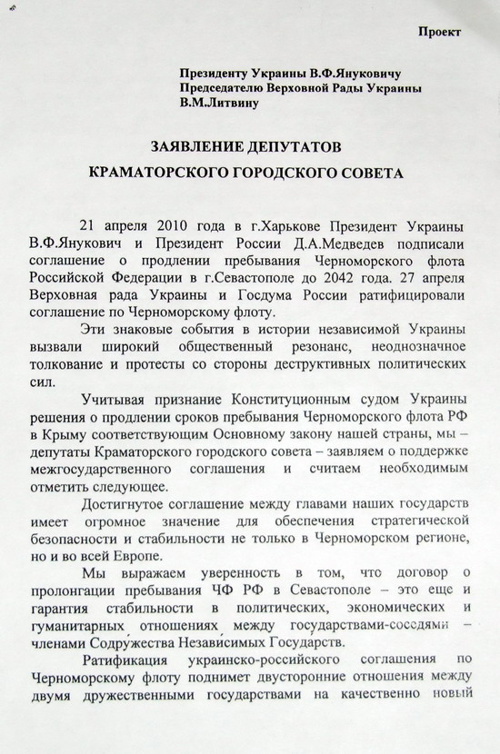 Краматорские депутаты на очередной сессии городского совета приняли обращение к Президенту Украины Виктору Януковичу и спикеру Верховной рады Владимиру Литвину. Это заявление было полностью посвящено событиям, которые разгорелись вокруг подписания 21 апреля соглашения о продлении пребывания Черноморского флота РФ в Севастополе до 2042 года. Нужно сказать, что сам текст документа является просто эталоном политического словоблудия.