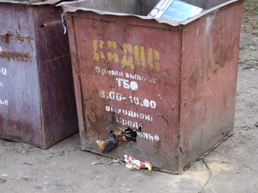 Такие вот замечательные мусорные баки установлены по улице Красная зоря в Старом городе. Самое любопытное, что сквозные дыры не помешали частному ЖЭКу нанести на них свое называние и время вывоза твердых бытовых отходов. Хотя этими самыми отходами являются скорей контейнера для мусора.