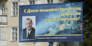 Судя по убогому дизайну, реклама, действительно, была дармовой — с плакатов на горожан смотрит градоначальник, размещенный на фоне ДКиТ НКМЗ или какого-то абстрактного механизма. Почему-то на плакатах даже не удосужились разместить городскую символику, появлением которой так гордились еще год тому назад.