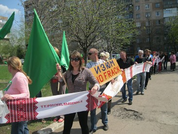 Участники автопробега против добычи сланцевого газа, которые ехали на митинг в Донецк, тоже пришли посмотреть на этот уникальный рушник. Митингующие его развернули и пронесли вокруг библиотеки.