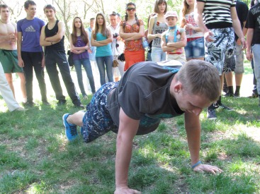 Акция прошла в парке "Юбилейный", в ней приняли участие 77 человек возрастом от 5 до 55 лет. Суть акции заключается в том, что бы участники отжались от земли то количество раз, сколько дней мы прожили в мире.