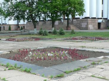 Таким образом грубые бетонные конструкции превратились в цветочные клумбы. Конечно же сам факт очень радует, но борта резервуаров возле центрального бассейна, в которых также посажены цветы разрушены и обрисованы местными художниками-энтузиастами.