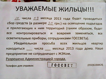 Совсем недавно на подъездах многоэтажек Краматорска появились объявления с необычным содержанием. Жильцов оповещали (прошу заметить, даже не предлагали), что в назначенный день с них будут собирать по 30 гривен на освещение подъездов и прилегающих к ним территорий. В объявлении обещали, что благодаря собранным средствам все «будет контролироваться и вовремя заменяться, все осветительные приборы сотрудниками ГОССВЕТА». При этом новое предприятие не сотрудничает с ЖЭКом, и действует с разрешения администрации города.