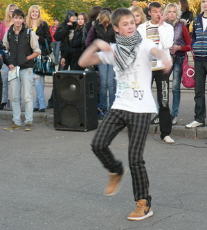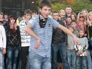 О цели данного мероприятия нам рассказал один из инициаторов — Игорь Сокур. По его словам, для того, чтобы организовать такое мероприятие, им пришлось пройти через немалые перипетии — общение с милицией и круговой пробег по инстанциям исполкома: «Такие пати мы начали проводить еще в середине лета на поселках, а потом и в город перебрались – на площадь. Поначалу все было нормально, но потом приехала милиция и объяснила нам, что это уже мероприятие общественное, и на него нужно разрешение. Мы люди законопослушные, потому отправились в исполком. Тут начался многокруговой забег по всевозможным инстанциям и отделам. Из одного отдела нас отправляли в другой, оттуда в еще один, и так продолжалось до бесконечности. Пока мы, наконец-то, не подключили юристов — они составили заявление, и нас уже не смогли «отфутболить» в горисполкоме. Теперь наши танцевальные вечера квалифицируются как общественные мероприятия». По словам Игоря, свой выбор они остановили на танцах ввиду того, что эта ниша не была еще занята, в отличие, например, от музыки. И это оказалось правильным — зажигательные танцы не оставили безразличными ни одного из прохожих — все останавливались посмотреть на пляшущих ребят.