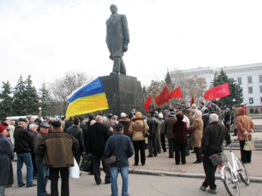 Ну, а пока идет этот "первый этап", коммунисты действуют наглядной агитацией и жгучим поэтическим языком. Всеобщее внимание привлекал гражданин, который каким-то образом умудрился слепить на одной удочке сразу два государственных флага - Украины и России. Все это весьма напоминало глумление над государственными символами, но старики, знаете ли, иногда чудят...