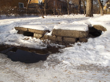 Побывав на месте, корреспондент "НК" зафиксировал следующую картину: ручеек из колодца без остановки бежит по улице, через несколько метров вода замерзает, и превращается в лед. Таким образом на дороге "намерз" уже большой участок катка (ведь дорогу не посыпают). Сам колодец полностью заполнен водой, мусором и опавшей листвой. Сверху на нем вместо люка лежит ...дверь, которую можно легко переместить. В надежность такой конструкции верить не приходится.