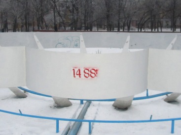 Надпись "1488" сделана при помощи трафарета. Кстати, "1488" - кодовый лозунг (употребляется в качестве приветствия или подписи) у белых националистов (более известных как скин-хэды)