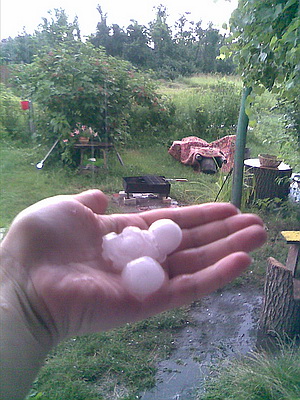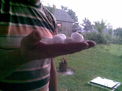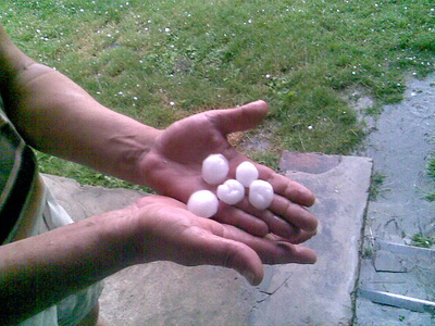 Вот такой град выпал вчера 11 июля под Святогорском. Около 14 часов там началась сильная гроза. Некоторые градины были размером с малое куриное яйцо. Поскольку интенсивность выпадения града была невелика, больших повреждений он не нанес.