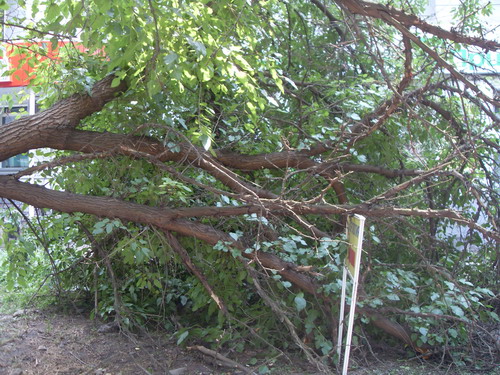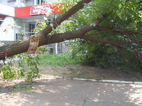 Вот уже три дня лежит дерево по ул. Ленина в Краматорске. Оно упало после сильного ливня 11 июля. Дерево снесло так, что перекрыло дорогу к отделению банка по ул. Ленина.