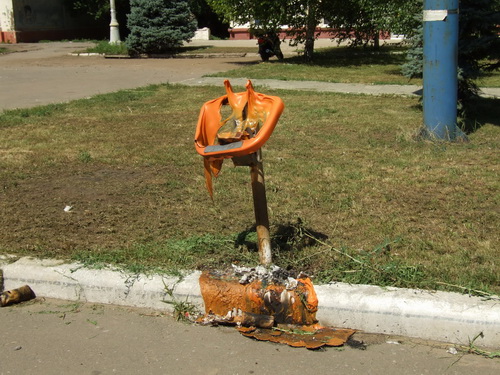В ночь на 15 июля горожане учинили настоящий разгром в сквере профсоюзов. Урнами, которые находились ближе к проезжей части, неизвестные перегородили улицу Шкадинова. А остальные семь просто закинули в фонтан. Кроме того, была сожжена пластиковая урна на перекрестке улицы Шкадиновой и площади Ленина. Ее стоимость около 700 гривен.