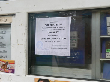 Стоит отметить, что на сигареты из старого запаса и те, которые еще остались на складах, продавцы стали «накручивать» цену. На некоторых ларьках висят объявления о подорожании. Цена на сигареты подскочила от 50 коп. до гривны (якобы выросли затраты на доставку).