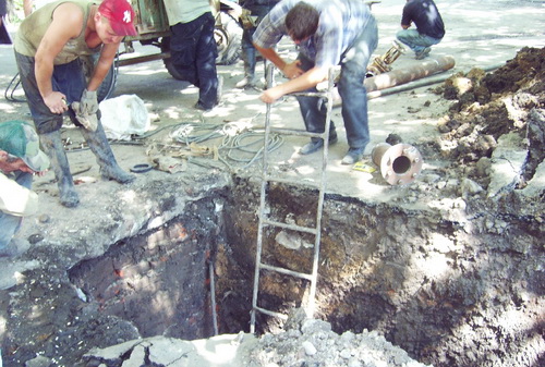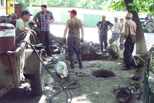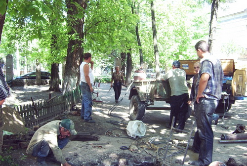 Ремонтники из водоканала работают во дворе по ул.Ленина, 22. Из-за ремонта они вынуждены спускать воду из колодца по ул.Марата.