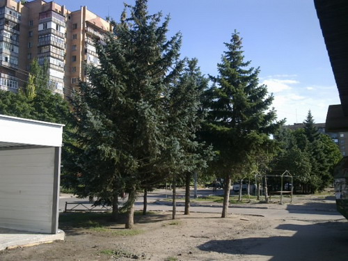 Сооружение расположено прямо на аллее деревьев. По обе стороны от него - каштан и голубые ели. При любом расширении площади киоска они могут быть спилены. Тенденция размещения киосков практически на газонах может привести к дальнейшему уменьшениию насаждений в городе.