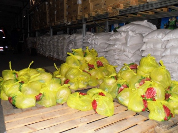 В данный момент фасуется гуманитарная помощь для города Красногоровки (Марьинский район). Туда будет направлено 7 000 продуктовых наборов. Помогают фасовать гуманитарный груз волонтеры - учащиеся Высшего профессионального училища № 42.