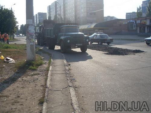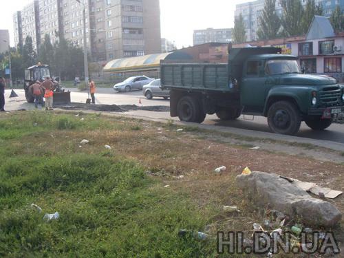 Несмотря на 40-градусную жару, коммунальщики работают над улучшением краматорских дорог.