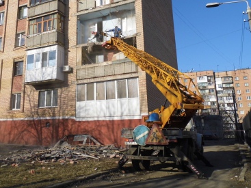 Работники МЧС приступили к разборке, разрушенных во в время обстрелов, балконов. Представители Министерства Чрезвычайных Ситуаций проведут полный демонтаж конструкций, а их восстановлением займется городское управление ЖКХ.
