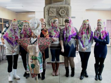 Сначала, как и полагается, были вступительные слова и поздравления, рассказы об истории этого праздника. Празднование Масленицы сопровождалось выступлением очаровательных студенток, которые в костюмах «барышень» читали стихи о проводах зимы, блинах и катание на санках. И каково же гуляния на Масленицу без традиционного сжигания обрядового чучела (которое, впрочем, выглядело очень симпатично, поэтому активно принимало участие в фотосессии со всеми желающими).
