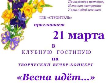 Сегодня, 21 марта, в городском дворце культуры "Строитель" пройдет творческий вечер концерт "Весна идет..."