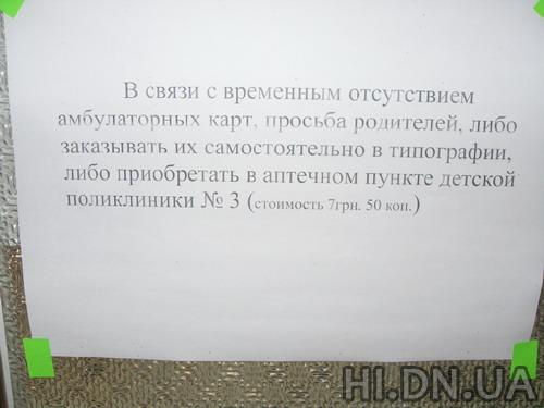 С недавнего времени родителям в связи с отсутствием амбулаторных карт в детской поликлинике приходится покупать их в аптеке по 7 грн. 50 коп. «Если не хотите покупать, можете заказать в типографии», - советуют врачи.