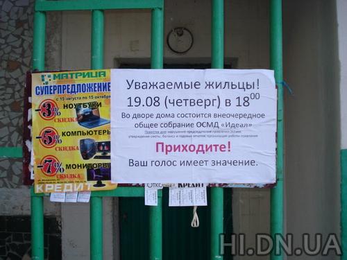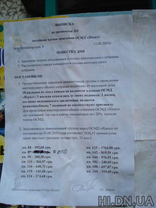 Вечером 19 августа во дворе дома № 8 по бульвару Краматорскому состоялось собрание жильцов, входящих в ОСМД «Идеал». На повестку дня выносились вопросы: нарушение председателем правления Николаем Дибровым устава ОСМД, утверждение сметы, баланса и годовых отчетов, организация работы правления.