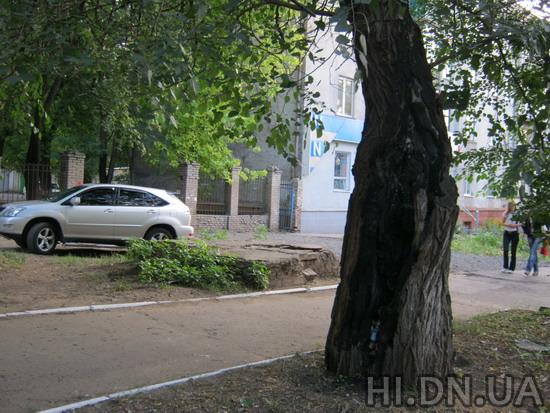 Дерево при этом еще живое, его крона располагается над тротуаром в районе дома № 24.