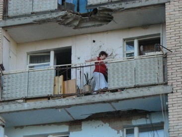 10 февраля 2015 года она была в своей квартире. В тот момент, когда она направлялась к балкону, со стороны улицы прямо на него рухнула с неба железная "сигара" - носитель зарядов "Смерча". Железо пробило балкон сверху и проделало дыру этажами ниже. В Галину Васильевну полетели стекло и кирпичное крошево, хозяйку квартиры отбросило в другой конец комнаты... Батарею в соседней спальне ударом отшвырнуло на несколько метров, из разованных труб хлещет горячая вода, в воздухе висит пыль...