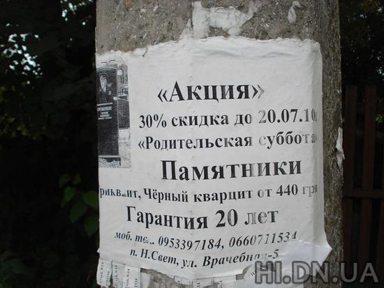 На соседнем столбе объявление сообщает о 30-процентной скидке на установку памятника из черного кварцита. Акция действовала только до 20 июля и называлась «Родительская суббота».