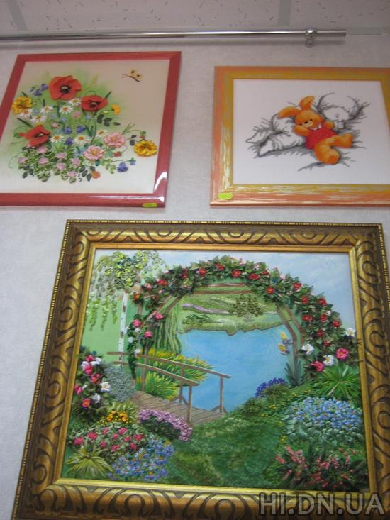 Сначала в магазин Надежда Прядка приходила за ленточками. Кстати, на один достаточно пышный цветочек идёт около 8 метров ленты. Позже она начала приносить картины на продажу. Причем, цена на такие картины не маленькая: от 200 до 1000 грн.