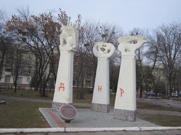 На недавно установленных в Сквере профсоюзов статуях скульптурной композиции "Відлуння Скіфії", вандалы краской намалевали надписи сепаратистского содержания