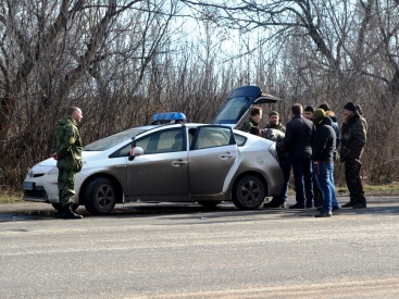 Сегодня около 8-ми утра, на въезде в город Славянск произошёл конфликт между инспекторами полиции и людьми в военной форме.