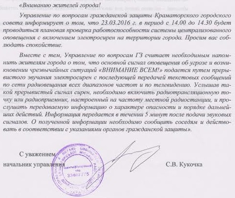 Управление по вопросам гражданской защиты Краматорского городского совета информирует, что 23 марта, в период с 14:00 до 14:30 будет проводиться плановая проверка работоспособности центральной системы оповещения с включением электросирен.