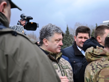 Его сопровождали председатель Донецкой ОГА Павел Жебривский, народные депутаты Украины Максим Ефимов и Артур Герасимов. В Краматорск, вместе с президентом, также прибыл министр обороны Украины Степан Полторак.