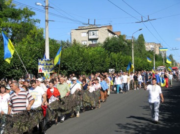 Сотни и сотни людей, в национальной одежде и с украинскими символами в руках, прошлись по улицам города, скандируя лозунги, главный из которых - "Краматорск - это Украина!"